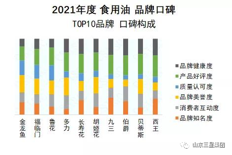 2021年度食用油品牌口碑總指數(shù)從品牌知名度、消費(fèi)者互動(dòng)度、品牌美譽(yù)度、質(zhì)量認(rèn)可度、產(chǎn)品好評(píng)度、品牌健康度等方面,分維度對(duì)知名食用油品牌進(jìn)行量化分析,最終優(yōu)選出食用油口碑TOP10品牌。