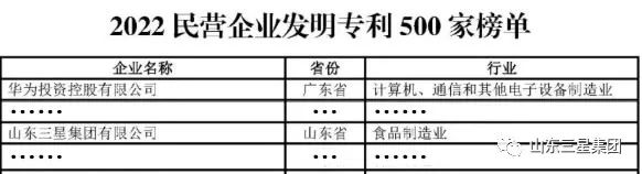 日前,全國工商聯(lián)發(fā)布“2022民營企業(yè)研發(fā)投入500家”“2022民營企業(yè)發(fā)明專利500家”雙榜單,山東三星集團(tuán)科研實力強勁、專利成果突出,成功入圍“2022民營企業(yè)發(fā)明專利500家”名錄。