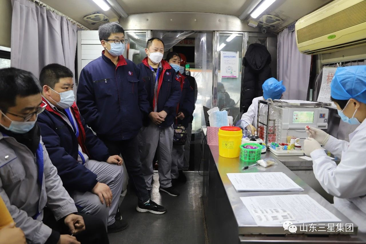 2月10日上午,濱州市中心血站愛心獻血車駛?cè)肷綎|三星集團總部,這里早已站滿了等待獻血的三星員工。