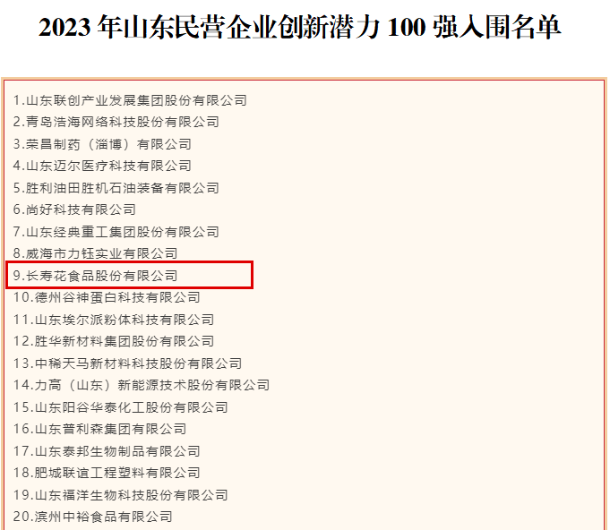 近日,山東省工商聯公示2023年山東民營企業(yè)100強系列榜單,憑借雄厚的產業(yè)實力和卓越的創(chuàng)新能力,長壽花食品入圍2023年山東民營企業(yè)創(chuàng)新潛力100強,充分展現了企業(yè)發(fā)展的強大動能和巨大潛力。