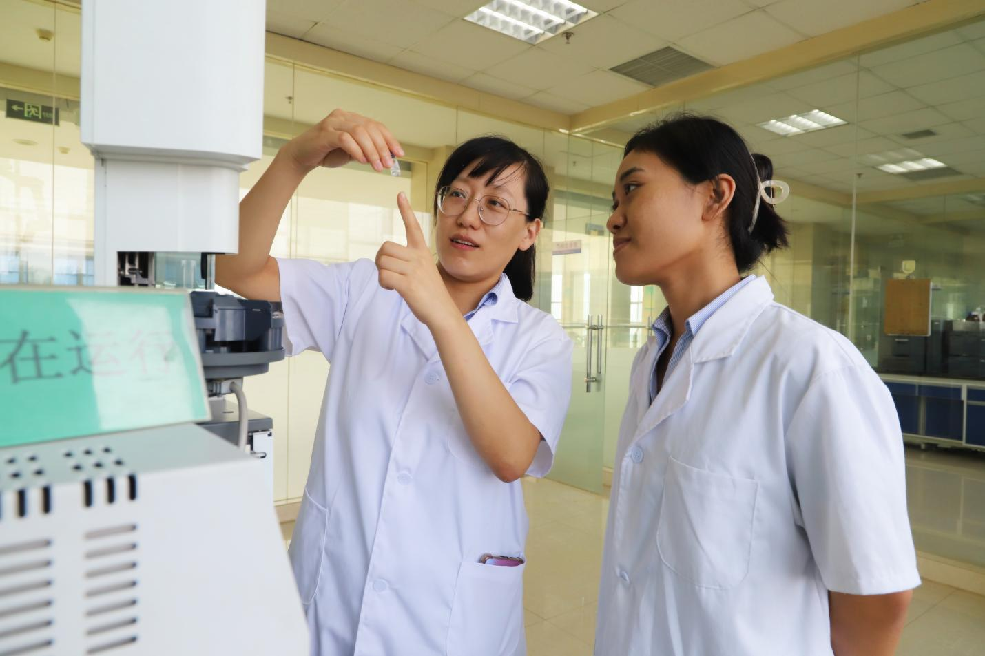 技術(shù)中心實驗現(xiàn)場,程芳園(左)與新員工楊新月正在就食用油中植物甾醇的含量檢測進(jìn)行指導(dǎo)交流,討論實驗中的常見問題和解決方法,分享自己的心得體會、工作經(jīng)驗,幫助新員工提高分析效率和準(zhǔn)確度。新老拍檔精誠攜手、思想碰撞,點燃科技創(chuàng)新的火花。