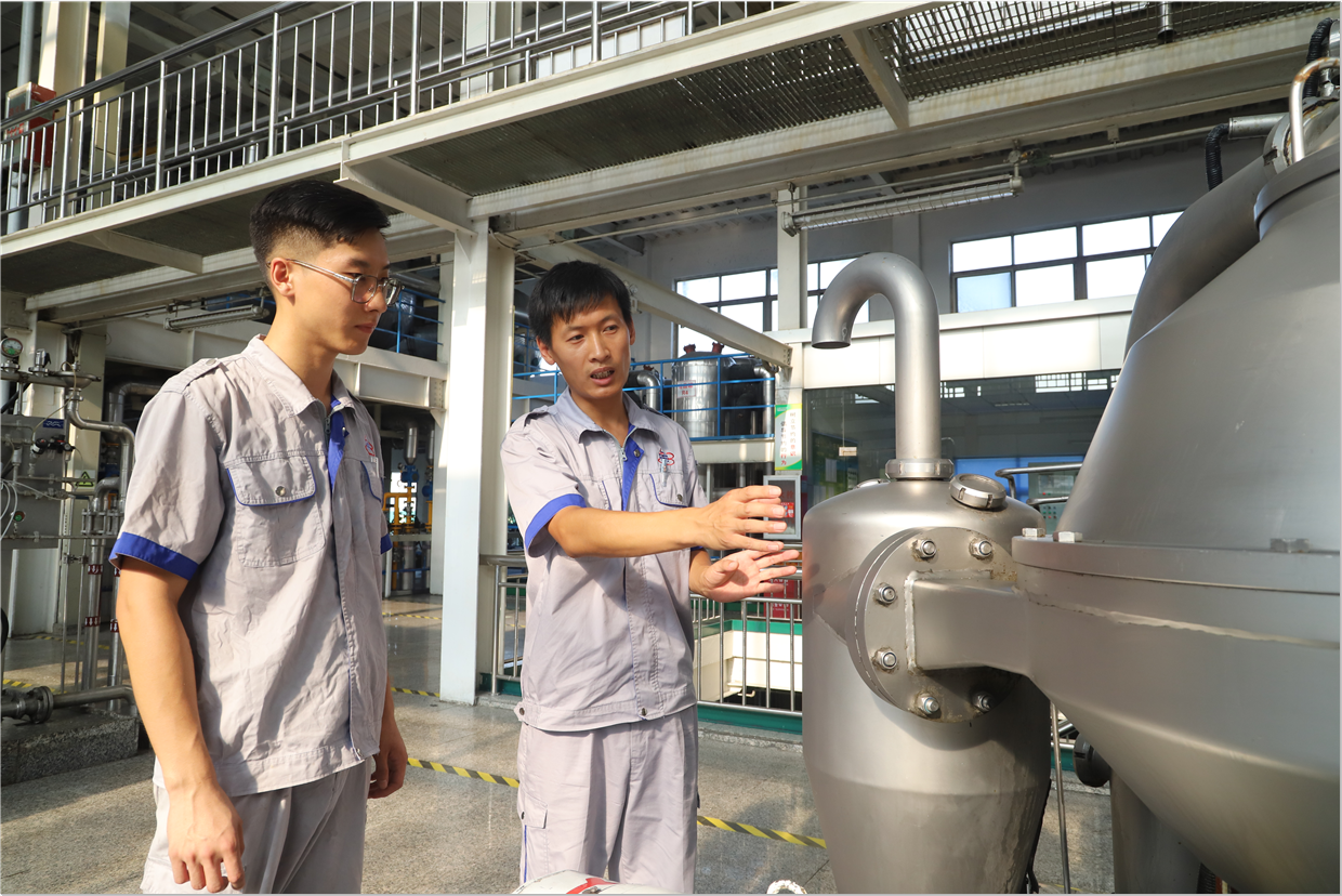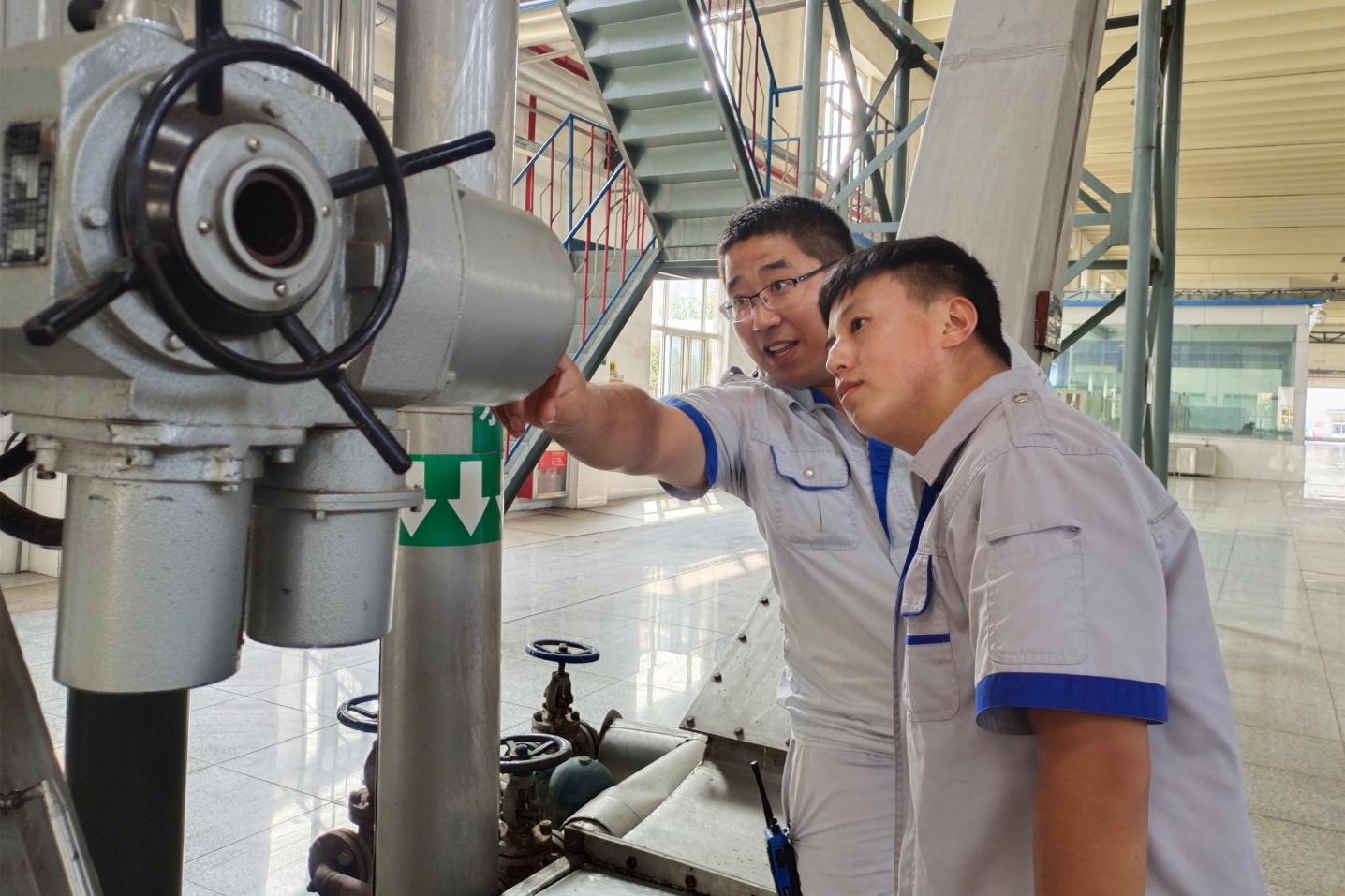 長壽花食品精煉三車間,馬海濤(右)向?qū)O慶金講解設(shè)備操作技能,如何做好實時監(jiān)測,優(yōu)化工藝指標(biāo),確保高效穩(wěn)定運行。這其中,傳授的不僅是技能和經(jīng)驗,還有初心使命和工作理念,也隨之一同入腦入心,扎實開啟“煉好油”的職業(yè)生涯。