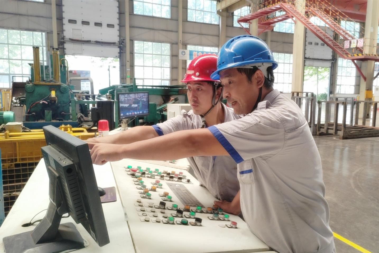 裕航合金擠壓三車間,26兆牛擠壓機班長韓寶磊(右)對新員工孫雙喜進(jìn)行手把手培訓(xùn),詳細(xì)講解擠壓機操作技能和工藝單執(zhí)行情況,讓新員工盡快熟悉崗位職責(zé),掌握機臺工藝流程及各項指標(biāo)參數(shù),為新員工順利上崗、投入工作發(fā)揮積極傳幫帶作用。