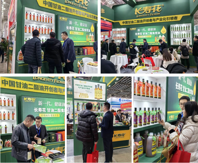 本次展會上,長壽花食品攜甘油二酯全系列產品驚艷亮相。含量從20%——80%的玉米二酯油、花生二酯油、葡萄籽二酯油、菜籽二酯油、亞麻籽油以及甘油二酯黑咖啡、代餐粉長壽花二酯油粉悉數(shù)到場。長壽花二酯油系列產品憑借其高品質、大健康等特點,吸引了眾多參會客商駐足關注,蒞臨展位探討合作交流。