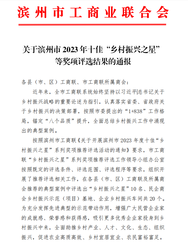 近期,濱州市工商聯(lián)發(fā)布《關(guān)于濱州市2023年十佳“鄉(xiāng)村振興之星”等獎(jiǎng)項(xiàng)評(píng)選結(jié)果的通報(bào)》,山東三星集團(tuán)董事長(zhǎng)、總裁王亞群榮獲濱州市2023年十佳“鄉(xiāng)村振興之星”榮譽(yù)稱(chēng)號(hào)。