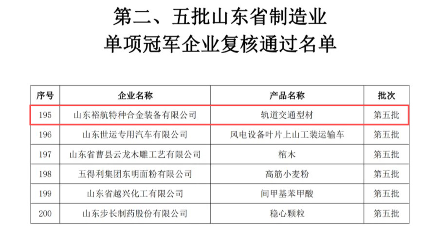 近日,省工信廳公布《第八批山東省制造業(yè)單項(xiàng)冠軍企業(yè)和通過(guò)復(fù)核的第二、五批制造業(yè)單項(xiàng)冠軍企業(yè)名單》,山東裕航特種合金裝備有限公司憑借“軌道交通型材”成功通過(guò)山東省制造業(yè)單項(xiàng)冠軍企業(yè)復(fù)核。