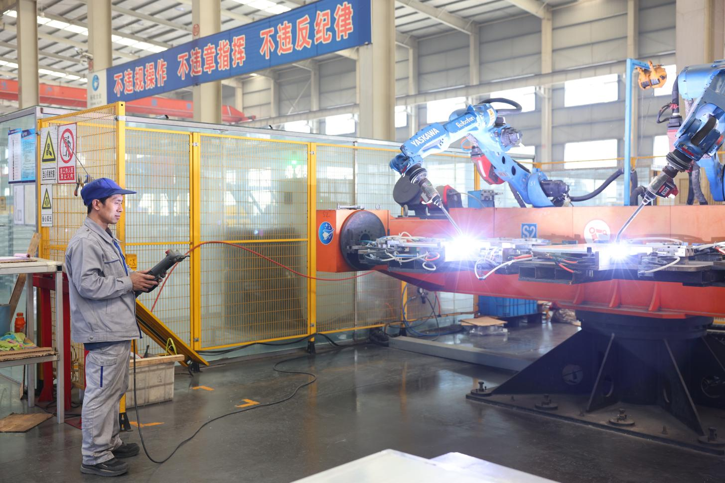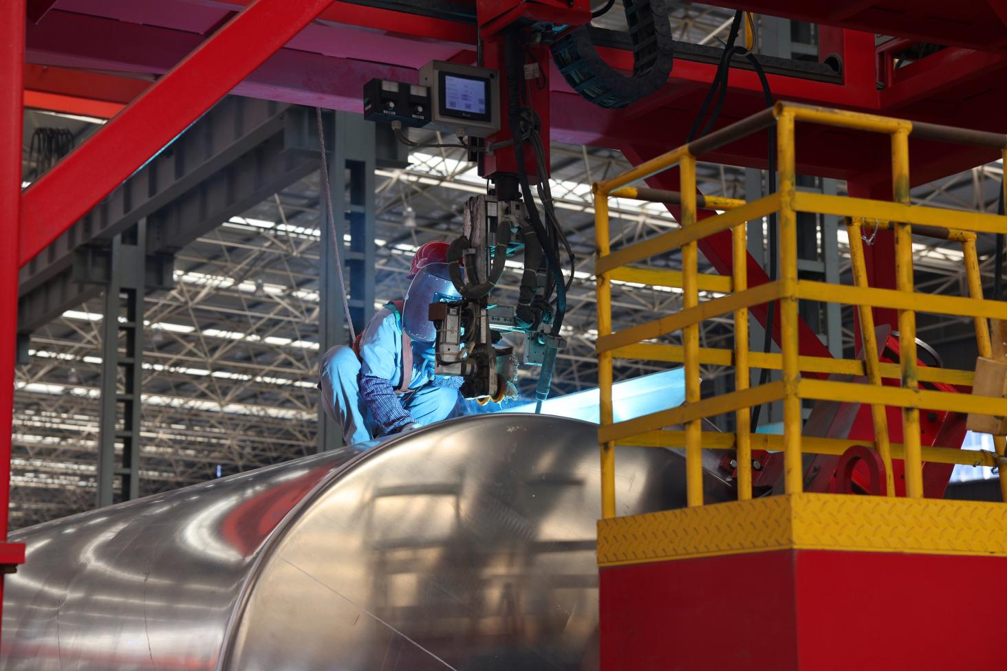 →機(jī)械公司罐車(chē)生產(chǎn)線上,員工正在進(jìn)行出口產(chǎn)品的焊接作業(yè)←
