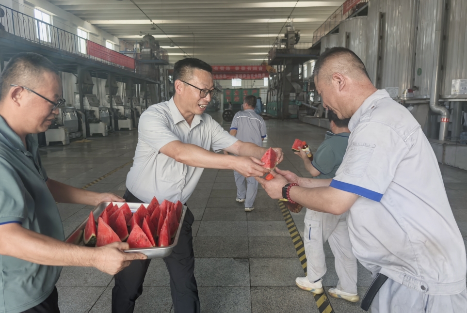 近日,持續(xù)的高溫天氣給堅(jiān)守崗位的一線(xiàn)員工帶來(lái)嚴(yán)峻“烤”驗(yàn)。為切實(shí)保障炎炎夏日一線(xiàn)員工身心健康,長(zhǎng)壽花糧油加工公司執(zhí)行總經(jīng)理王學(xué)剛、長(zhǎng)壽花食品科技公司執(zhí)行總經(jīng)理王奎帶著西瓜、涼茶等降溫物品深入生產(chǎn)車(chē)間一線(xiàn),為員工送去清涼與關(guān)懷。